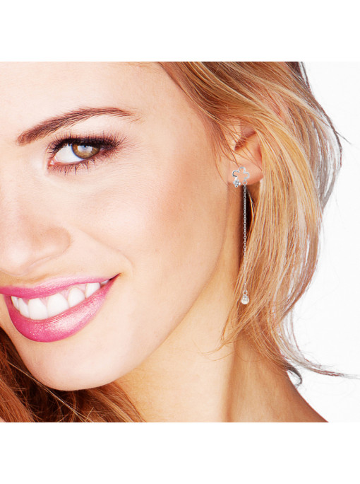 - Boucles d'Oreilles Pendantes motif "TREFLE" avec chaîne Maille Forçat Longueur 7 cm et Perles Blanches- Argent 925 Millièmes - Oxydes de Zyrconium - Système Poussettes